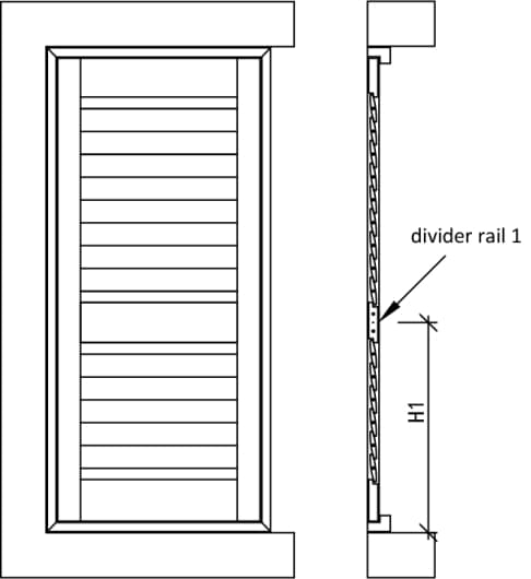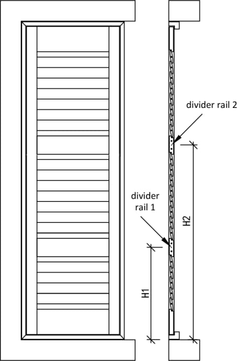 Shutter Dividers fall into two catogories, Tier on Tier and Midrails. Dividers are required when shutter heights are 1800mm and over, and a second divider is required when the height is 2700mm and over. This can be a combination of either Tier on Tier and one or two Midrails. Divider heights are measured from the base of the recess (inside), or base of the frame (outside), to the centre point of the divider.